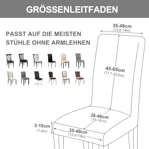 - ✅ Stuhlhussen in Universalgröße: Hergestellt aus hochelastischem Stoff. Geeignet für die meisten Stühle ohne Armlehnen. Rückenhöhe (45-65cm), Rückenbreite (35-48cm), Sitzlänge (38-46cm), Sitzbreite (35-48cm), Sitzstärke (2-10cm). Bitte messen Sie die Größe des Stuhls und vergleichen Sie vor dem Kauf.