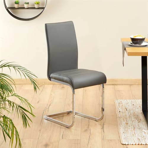 Das verchromte Metallgestell ist nicht nur sehr stabil sondern verleiht dem Freischwinger auch eine moderne, helle Note.Materialbeschreibung: – Der Stuhl ist bequem gepolstert – Der Bezug ist aus Kunstleder und leicht zu reinigen – Das Metalgestellt ist verchromt Austattung / Merkmale des Produkts: – Stuhl im 4er Pack erhältlich – mit Kunstleder in grau überzogen – das Metalgestell ist verchromt –