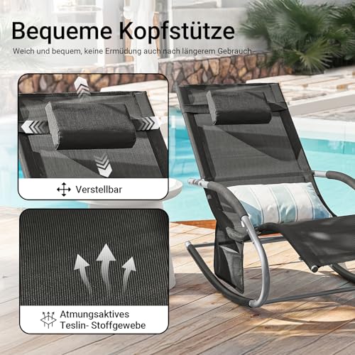 Belastbarkeit: bis 150 kg, Gewicht: 12,50 kg/je Artikel, Material: Gestell: Metallrohr, Bezug: Kunstfasergewebe, Maße: Siehe Abbildung, Elegante Sonnenliege zum Schaukeln in modischen Schwarz, atmungsaktive Liegefläche; abnehmbares Kopfkissen; mit integriertem Seitentaschen, Rahmen als Armlehnen…